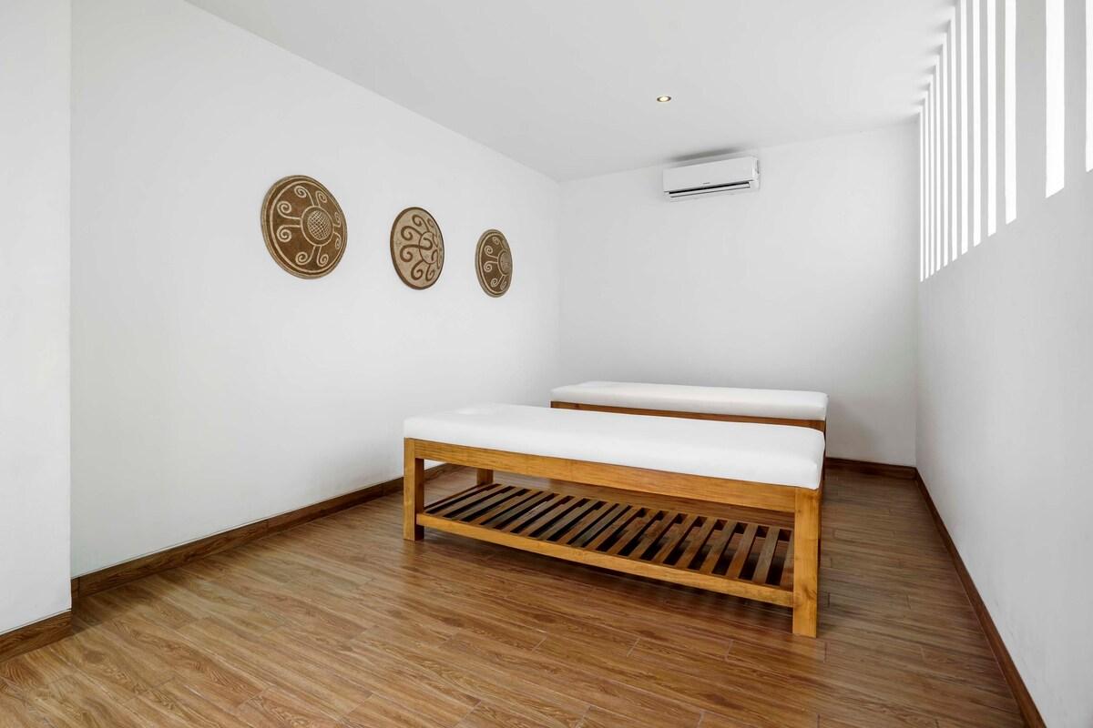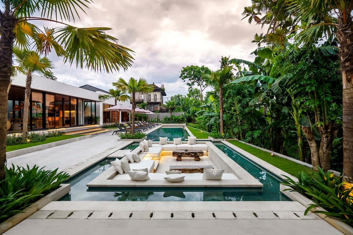 Welcome to paradise for up to 12 people, just south of Ubud centre! This 5 bedroom villa will take your breath away with its bright and spacious architecture and stunning nature view. A newly built, bright and modern villa with natural materials and traditional decoration is waiting for you and your friends/family. All 5 bedrooms are equipped with A/C, TV, safety box and pri...